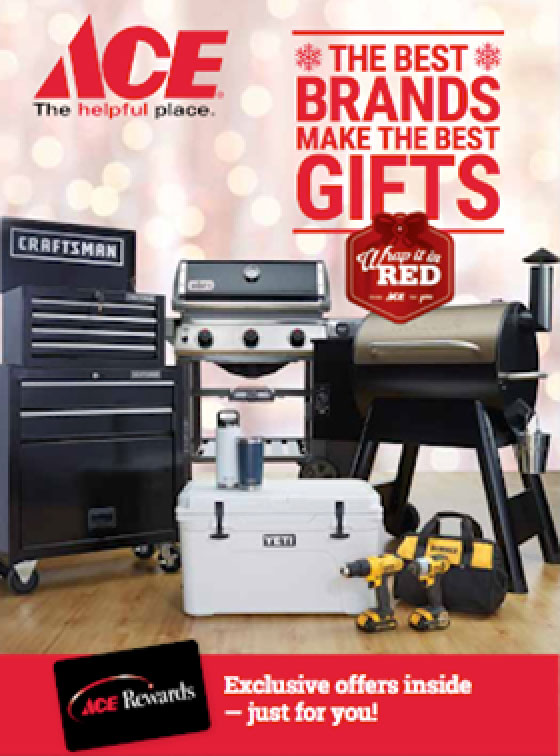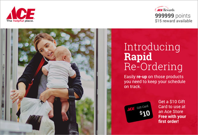The red Ace Helpful Place logo is prominent on all panels of a mailer or postcard. Our Ace Rewards logo must also be visible on all panels of a mailer or postcard and visually represented as the Ace Rewards card.