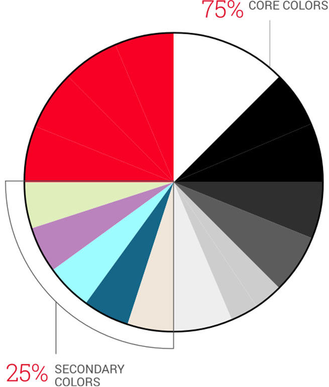 Secondary colors should never occupy more than 25% of the overall color distribution and should not be used as background colors.